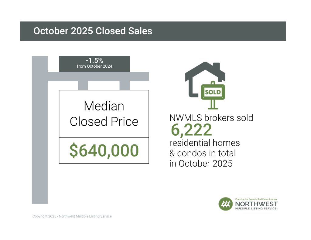The median sales price for residential homes and condominiums sold in October 2025 was $640,000 — a slight decrease of 1.5% when compared to October 2024 ($650,000). Compared to the previous month, the median price increased by 1.5% ($630,700 in September 2025).