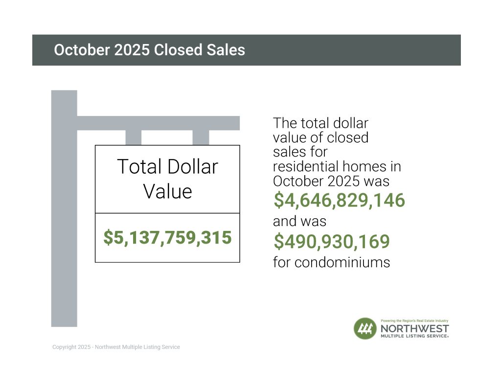 16 out of 27 counties saw a decrease in the number of closed sales year-over-year, while 10 saw an increase, and 1 showed no change (Wahkiakum). The six counties with the largest increases were Grays Harbor (+44.3%), Chelan (+30.7%), Kittitas (+26.1%), Grant (+24.3%), Clallam (+19.8%), and Douglas (+13.5%). The total dollar value of closed sales in October 2025 for residential homes was $4,646,829,146 and was $490,930,169 for condominiums ($5,137,759,315 in total).