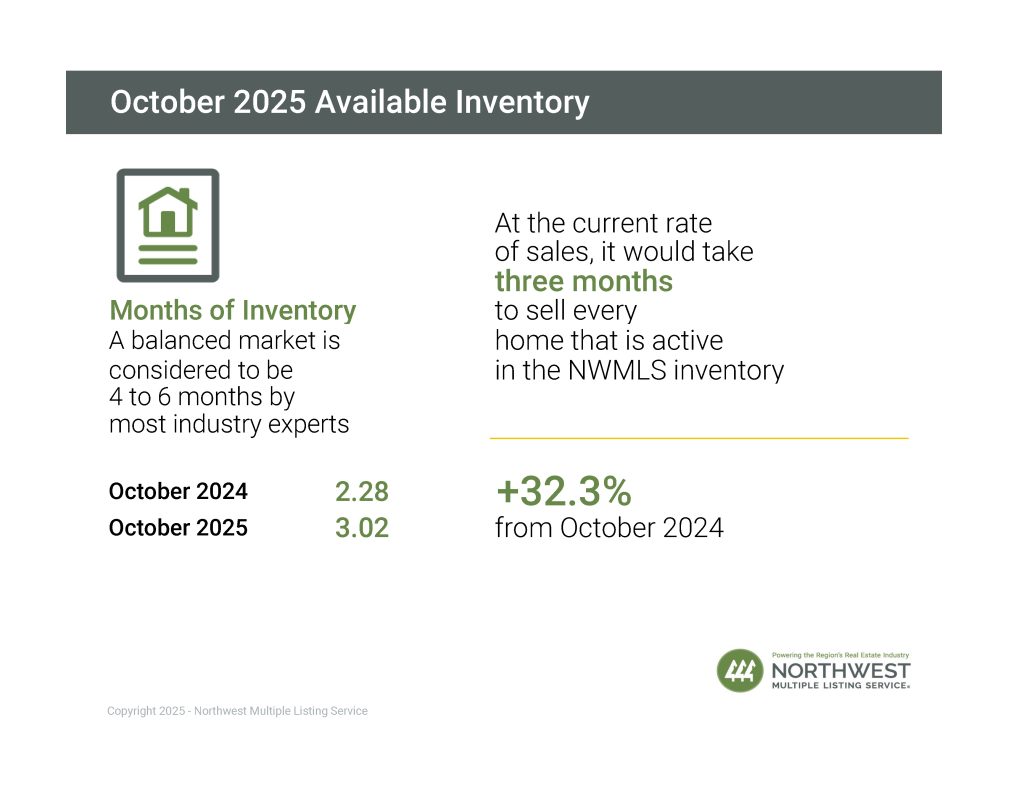 A balanced market is considered to be 4 to 6 months by most industry experts. At the current rate of sales, it would take around 3 months (3.02) to sell every home that is active in the NWMLS inventory. The six counties with the lowest months of inventory in October 2025 were Kitsap (2.06), Snohomish (2.39), Douglas (2.53), Thurston (2.59), Clallam (2.6), and King (2.67).