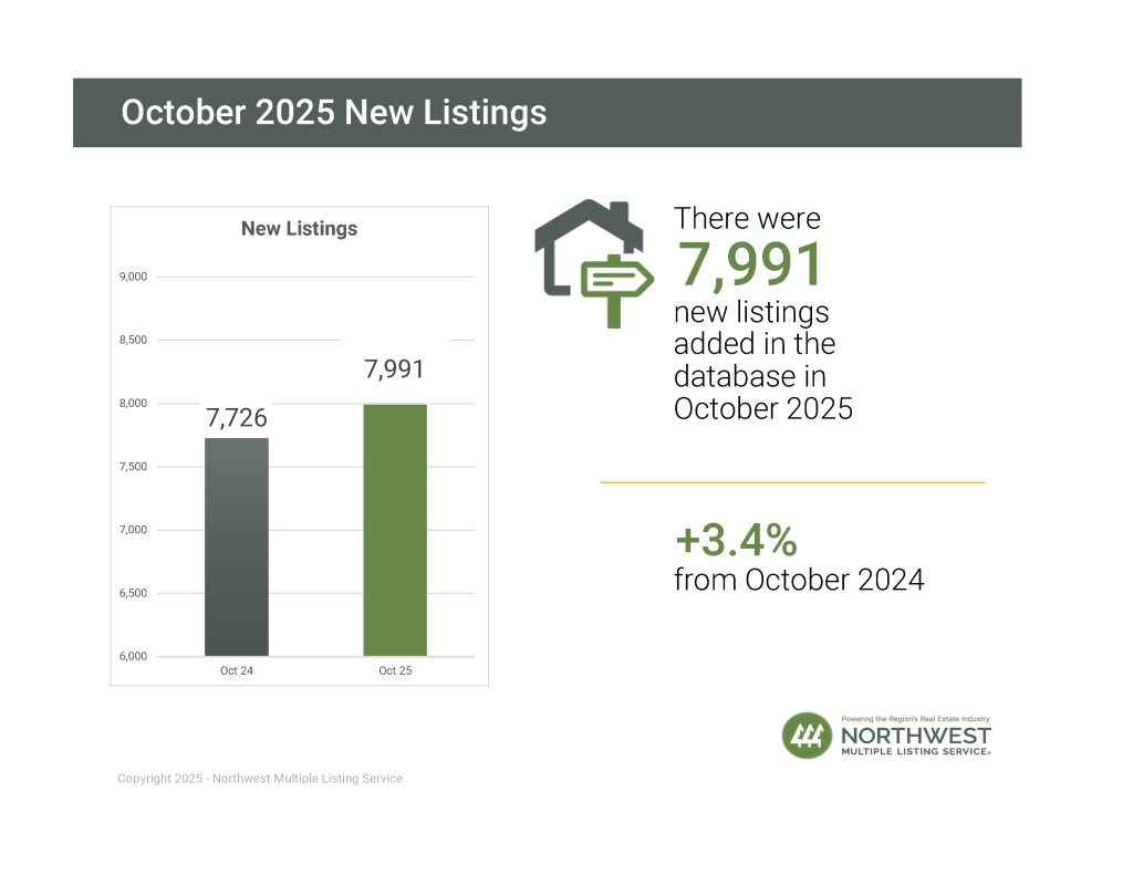 NWMLS brokers added 7,991 new listings to the database in October 2025, a year-over-year increase of 3.4% compared to October 2024 (7,726). When compared to the previous month (September 2025), new listings decreased by 13.1%, when 9,193 listings were added to the NWMLS database.