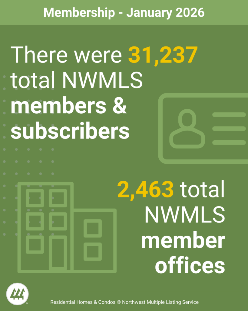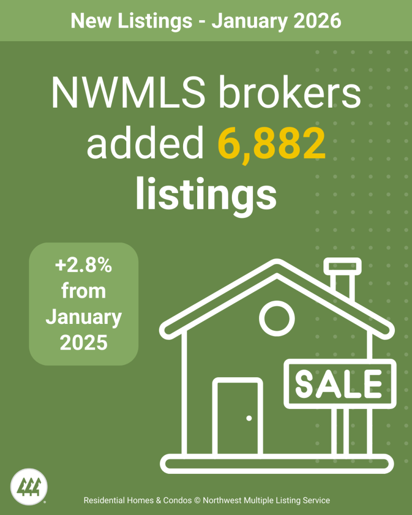 NWMLS brokers added 6,882 new listings to the database in January 2026, a year-over-year increase of 2.8% compared to January 2025 (6,693). When compared to the previous month (December 2025), new listings increased by 114.9%, when 3,202 listings were added to the NWMLS database.