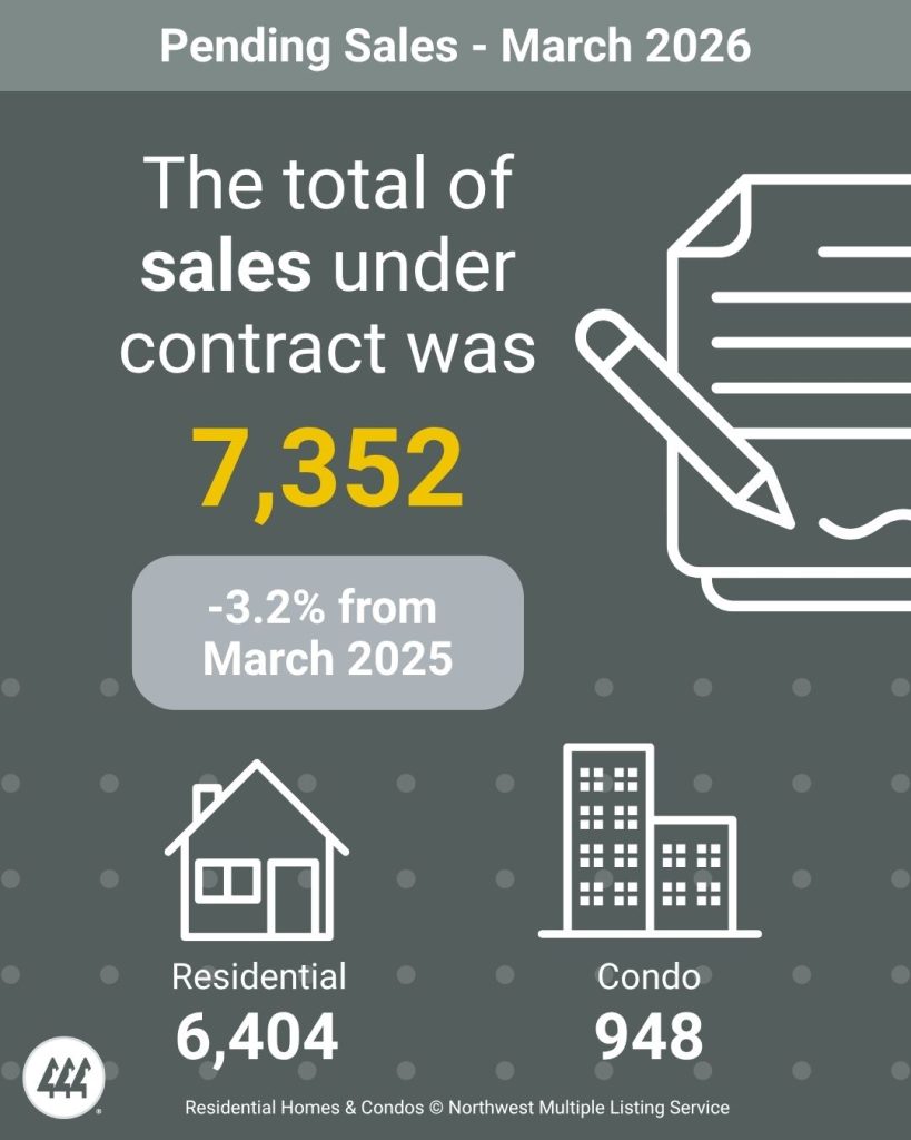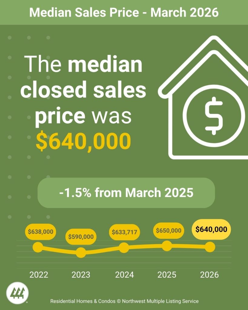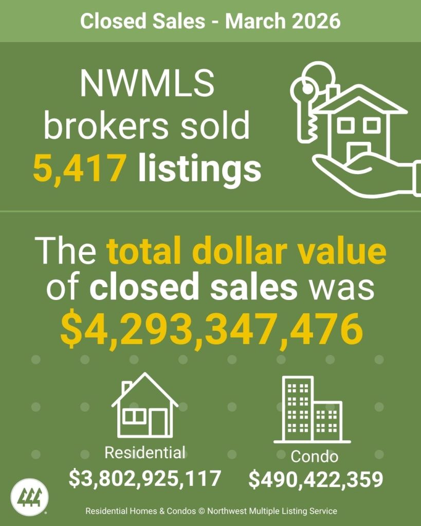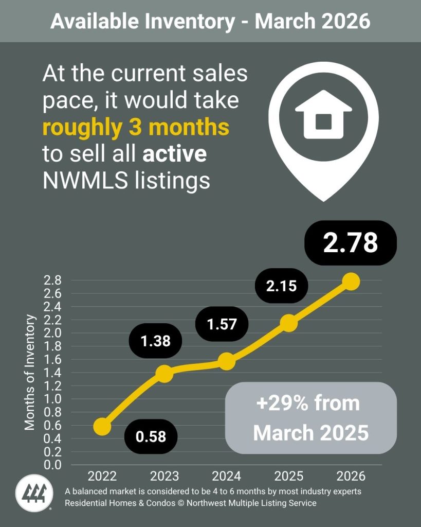 A balanced market is considered to be 4 to 6 months by most industry experts. At the current rate of sales, it would take a little less than three months (2.78) to sell every home that is active in the NWMLS inventory. The five counties with the lowest months of inventory in March 2026 were Kitsap (1.57), Snohomish (2.04), Pierce (2.07), Thurston (2.09), and Cowlitz (2.42).