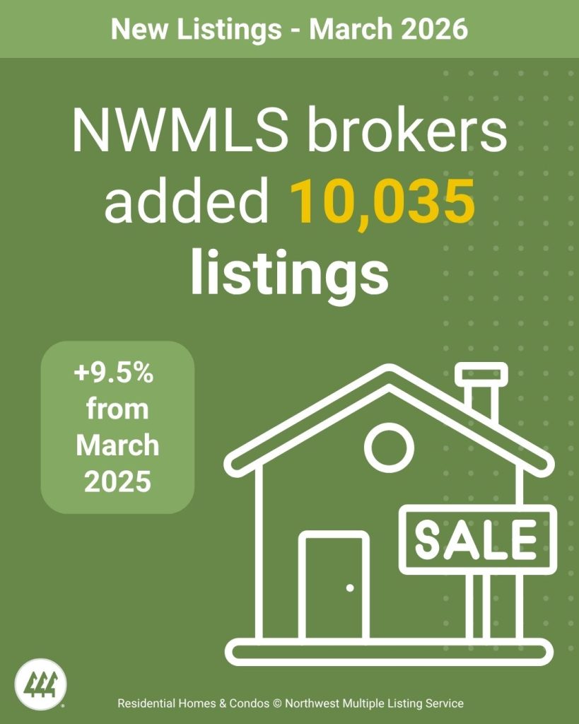 NWMLS brokers added 10,035 new listings to the database in March 2026, a year-over-year increase of 9.5% compared to March 2025 (9,161). When compared to the previous month (February 2026), new listings increased by 35.2%, when 7,424 listings were added to the NWMLS database.